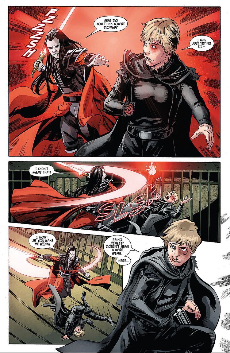 Guerra de las Galaxias #43, escrito por Charles Soule, con arte de Steven Cummings y Jethro Morales, tinta de Morales y Wayne Faucher, color de Rachelle Rosenberg y letras de Clayton Cowles, presenta una confrontación cargada de emociones entre Luke Skywalker y el espíritu Sith anónimo atrapado. En el cristal Kyber rojo, Luke adquirió varios números.