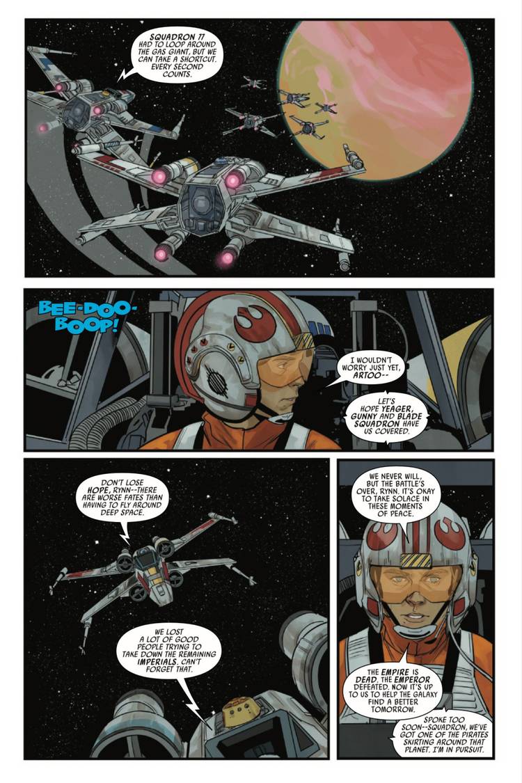 Segura prepara magistralmente el escenario en este primer número de su buque insignia Star Wars Serie, capturando la frágil esperanza que impregna la galaxia después de la batalla de Endor. El peso de los años de tiranía ha comenzado a levantar, y los héroes de la rebelión están lidiando con la inmensa tarea de construir un nuevo futuro. En medio de esta atmósfera de optimismo cauteloso, las palabras de Luke resuenan con un significado particular. En la superficie, son una declaración de hecho, una confirmación de la victoria que lucharon tan duro de lograr. Sin embargo, visto a través de la lente de la trilogía secuela, donde la resurrección de Palpatine arroja la galaxia al caos décadas después, la declaración de Luke adquiere un significado mucho más complejo y potencialmente presciente.