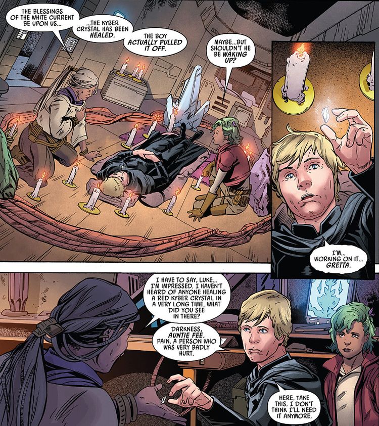 En Guerra de las Galaxias #43, el joven Skywalker revive una antigua práctica de la Fuerza sin querer. Como Fee explica después de que él despierta de su viaje astral, ella no “He oído hablar de alguien que ha sanado un cristal Kyber rojo en mucho tiempo..” Lo que probablemente quiere decir es: Luke naturalmente ha mostrado una habilidad antigua y olvidada.. Muchos fanáticos quieren una versión de Luke que se base en esto, madure hasta convertirse en el Maestro Jedi que merece ser y, como resultado, enfrente el futuro de Guerra de las Galaxias historias con cierto grado de aprensión e incertidumbre.