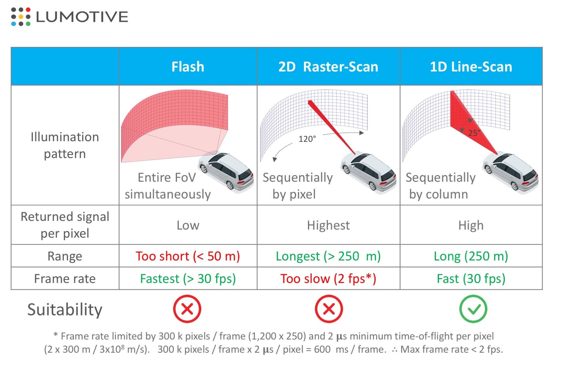 Lumotive ofreció el siguiente diagrama, que ayuda a visualizar los sistemas, aunque obviamente “idoneidad” y “demasiado corto” y “demasiado lento” son algo subjetivos: