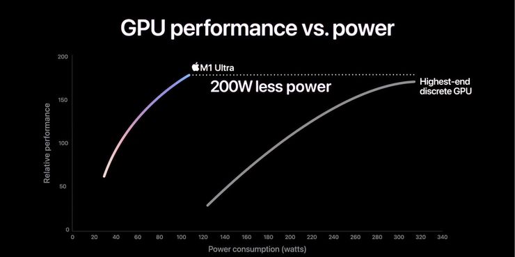 Las especificaciones de la GPU del M1 Ultra son impresionantes. La versión básica tiene 48 núcleos de GPU y puede llegar hasta 64 núcleos de GPU con su variante maximizada. También promociona 2,5 TB/s de ancho de banda de memoria total. En comparación, el RTX 3090 tiene menos de la mitad del ancho de banda de la memoria con solo 936,2 GB/s. En una de sus diapositivas de marketing para el M1 Ultra, Apple afirma que su chip tiene un rendimiento general de GPU más rápido que el RTX 3090, todo mientras usa aproximadamente 200 W de menos energía. Mirando exclusivamente esos números, es fácil pensar que la GPU del M1 Ultra es muy superior a la RTX 3090. ¿Verdad?