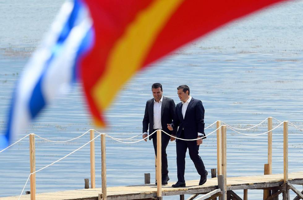 Mientras se celebraba la ceremonia de la firma, en Grecia las protestas contra el acuerdo degeneraron en enfrentamientos entre manifestantes y policías, que respondió con gases lacrimógenos en el pequeño pueblo de Pisoderi, a 25 kilómetros de donde se llevó a cabo la firma y donde se concentraron unas 500 personas. Seis policías y seis manifestantes resultaron heridos, indicó la policía. En Macedonia, unas 5.000 personas protestaron pacíficamente contra el acuerdo en Bitola (suroeste), en una concentración organizada por el principal partido de la oposición, VMRO-DPMNE, al que pertenece Gjorge Ivanov, presidente del país y principal detractor del pacto. La protesta se reprodujo horas después en la capital, Skopje.