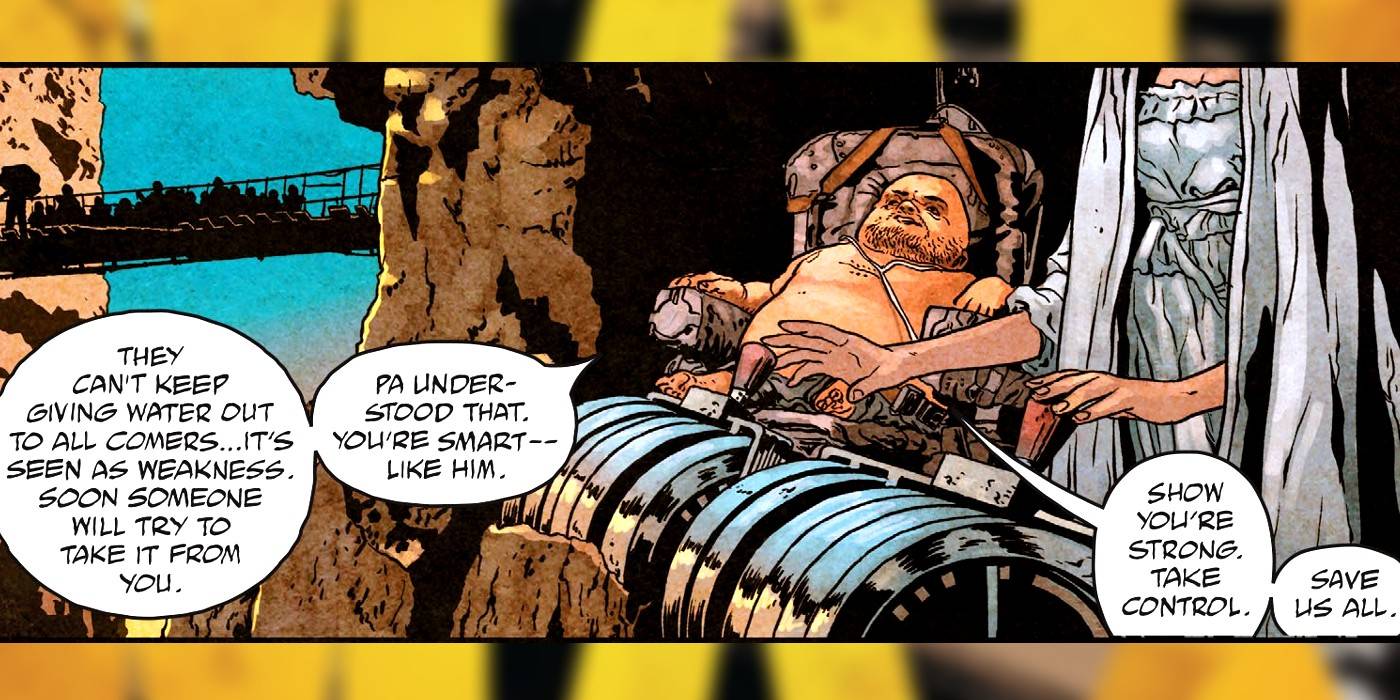 Mientras Furiosa y ‘las Esposas’ desprecian a Immortan Joe, el cómic hace que Corpus Colossus tiente al nuevo liderazgo de la Ciudadela con la amenaza que representa el mundo exterior, argumentando que regalar agua parece una debilidad. Con una mina de plomo cercana (también conocida como Bullet Farm) y una antigua refinería de petróleo (Gast Town) cercana, la Ciudadela es un premio inmenso para todas las demás fuerzas que intentan sobrevivir al post-apocalipsis. Y Si bien es un lugar increíblemente fácil de defender, tiene sido violado antes – Immortan Joe estableció su estatus legendario al reclamarlo de sus antiguos habitantes. Teniendo en cuenta estas consideraciones, el consejo de Corpus Colossus es persuasivo y podría incluso tentar a quienes sufrieron bajo el régimen de Joe.