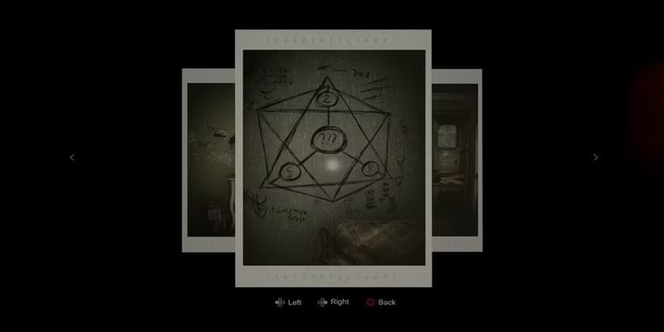 Una vez que los jugadores encuentran el rompecabezas del pozo en el sótano en MADISON, pueden volver arriba. En el piso principal de la casa, diríjase directamente por el pasillo hasta el comedor, luego atraviese la puerta en la parte trasera izquierda de la habitación. En esa habitación contigua, los jugadores verán una serie de formas geométricas superpuestas: dos triángulos y un hexágono. En medio de estas formas hay algunos círculos con signos de interrogación y símbolos. Los jugadores deben usar su cámara instantánea para tomar una foto de esta extraña marca en la pared, y la imagen que obtengan tendrá tres círculos amarillos. Las marcas en estos círculos amarillos corresponden a los símbolos que los jugadores deben usar en el pozo, así como la ubicación de los candados.