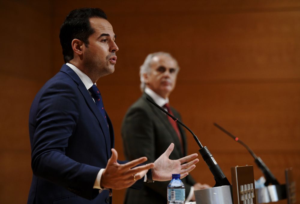 Es el día del Consejo de Gobierno. Aquí el portavoz del Ejecutivo es Aguado. Es la imagen del Gobierno. A media mañana, sin embargo, sufrió una zancadilla del ala popular. Otra más en realidad. “Hay que ser realistas”, observó el consejero de Sanidad, Enrique Ruiz Escudero, durante una entrevista a primera hora en TVE. “Es complicado llegar a los 6,5 millones de madrileños.”. Los dos se vieron las caras en el edificio central de la Puerta del Sol a las diez de la mañana. Ante este desencuentro público, los dos partidos determinaron que lo mejor era que salieran ambos a la rueda de prensa para limar las asperezas. Así fue. Y sucedió lo de siempre.