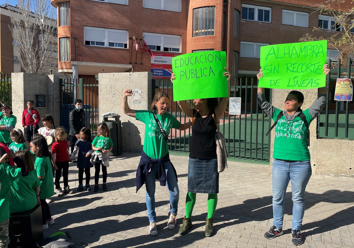 Por eso mismo, las familias del distrito de Fuencarral-El Pardo, destinado a perder cuatro líneas, se concentraron el jueves en las puertas del CEIP Alhambra para manifestarse en contra de la decisión de la consejería de Educación. Más de un centenar de niños y padres exigen una escuela pública para todos, tal como se podía leer en las camisetas y pancartas verdes que agitaban con fuerza. “Están intentando convertir el barrio en el kilómetro cero de la privatización. No lo vamos a permitir”, afirmaba Jaime Sorey, presidente de la asociación de padres (AMPA) del CEIP Alhambra, donde están matriculadas sus dos hijas, de tres y nueve años. En todo el distrito hay 22 colegios públicos para el segundo grado de infantil, frente a un total de 20 centros concertados, según datos oficiales de la Comunidad. En algunos barrios, sin embargo, el número de concertados supera a de los centro públicos.