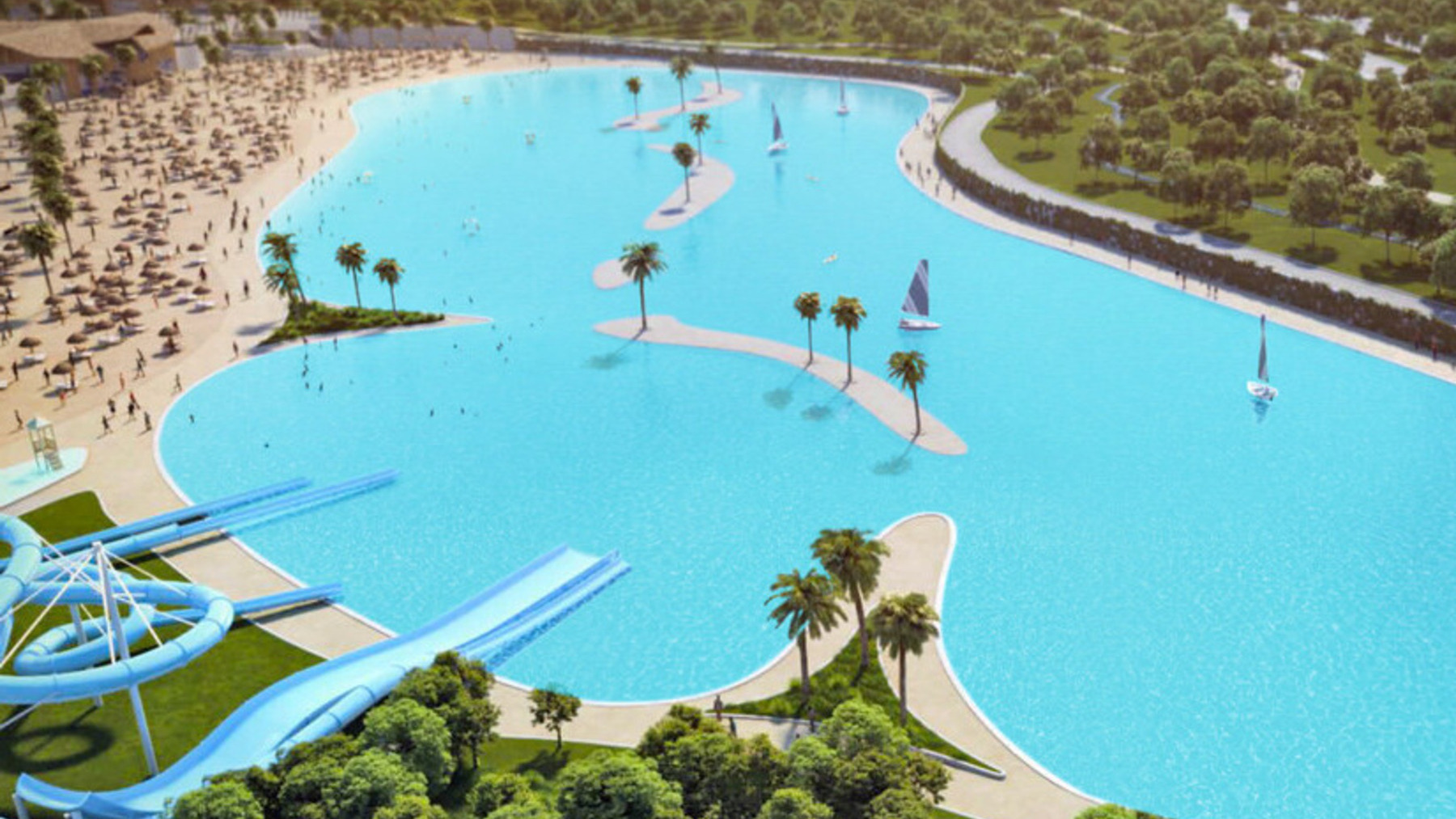 Se trata de un proyecto del grupo Rayet y consiste en una gran estructura acuática de 25.000 metros cuadrados con una profundidad de 2,5 metros. «No es una piscina convencional», especifica en la página web. Tendrá una serie de zonas diferenciadas: lámina de agua y playa, torres de toboganes, piscinas infantiles, zonas de entretenimiento y equipamiento deportivo, escuela de vela y deportes náuticos y área de restauración.