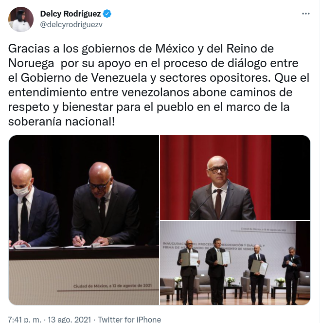 La vicepresidenta de Venezuela, Delcy Rodríguez, también agradeció a través de Twitter a México y Noruega, “por su apoyo en el proceso de diálogo entre el Gobierno de Venezuela y sectores opositores”.