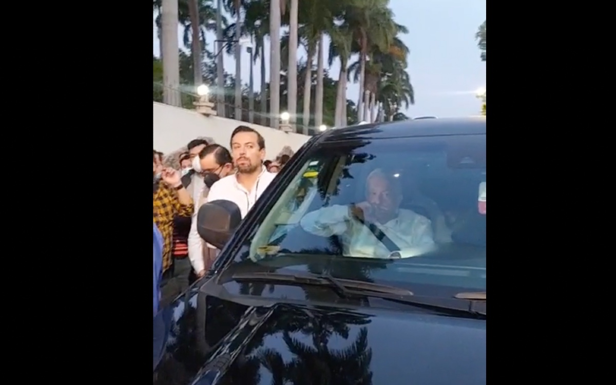 Evidentemente molesto, el presidente espera en su camioneta, resguardado por su equipo de seguridad, mientras se lanzan diferentes exigencias con megáfonos.