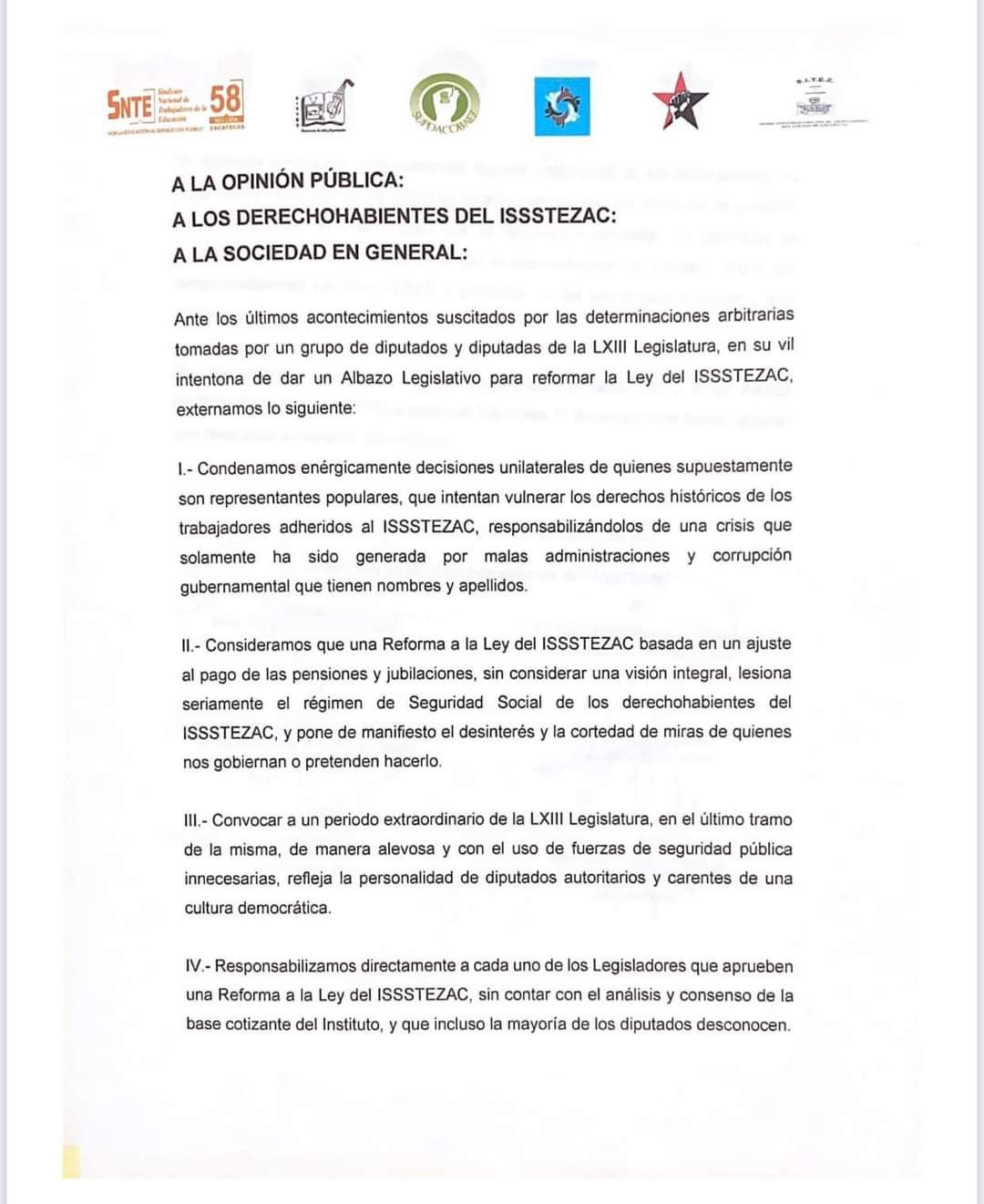 Esto, luego de que en sede alterna debido a las protestas, la Comisión Permanente del Congreso aprobara llamar a un periodo extraordinario para abordar la Ley del Instituto de Seguridad y Servicios Sociales para Trabajadores al Servicio del Estado de Zacatecas (ISSSTEZAC).