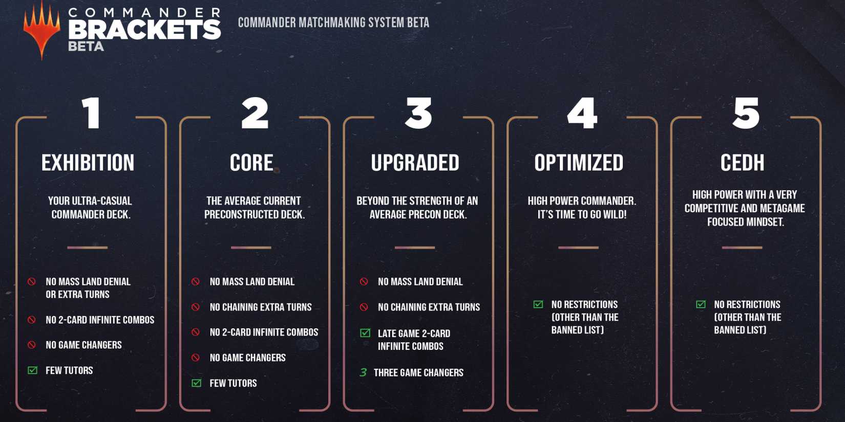El 11 de febrero MagiaEl principal diseñador de juegos Gavin Verhey publicó un artículo en el sitio web oficial del juego con versiones beta de los nuevos soportes de comandantes. Junto al soporte estaba Una lista de cartas de “cambio de juego” restringidas de ciertos soportes de nivel de potencia. Por ejemplo, Los soportes uno y dos no permiten cambios de juego, mientras que el soporte tres solo permite tres en un solo mazo. Los soportes también describen otras restricciones de construcción de mazos, como la destrucción de la tierra en masa en los niveles de potencia más bajos. Aunque la intención aquí es crear un sistema de rango de mazos más formal, Algunos defectos aparentes podrían hacer que sea aún peor que los niveles de potencia.