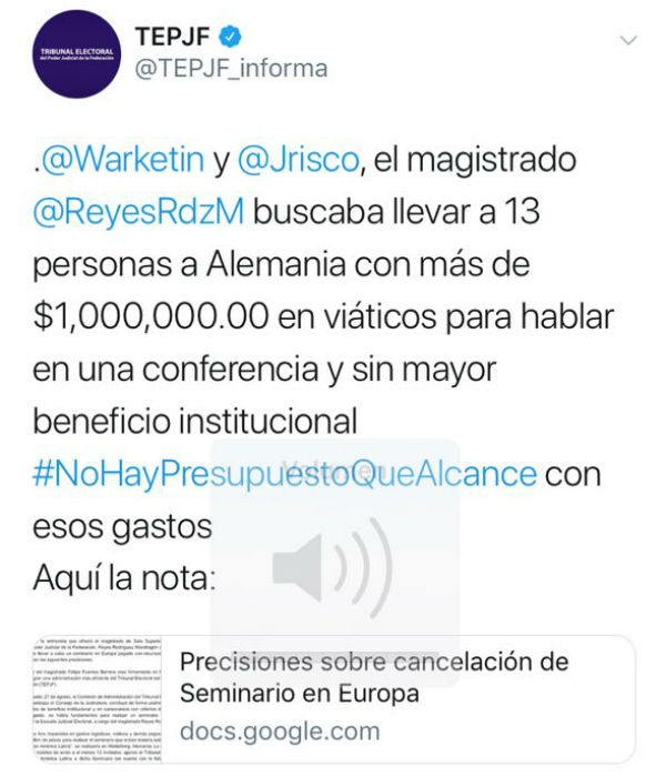 En la denuncia de hechos, Rodríguez Mondragón incluyó copias de tuits de la cuenta institucional del Tribunal donde le acusan de pretender gastar un millón de pesos en un seminario, cuando -apunta- la aprobación de los recursos correspondió al propio órgano.