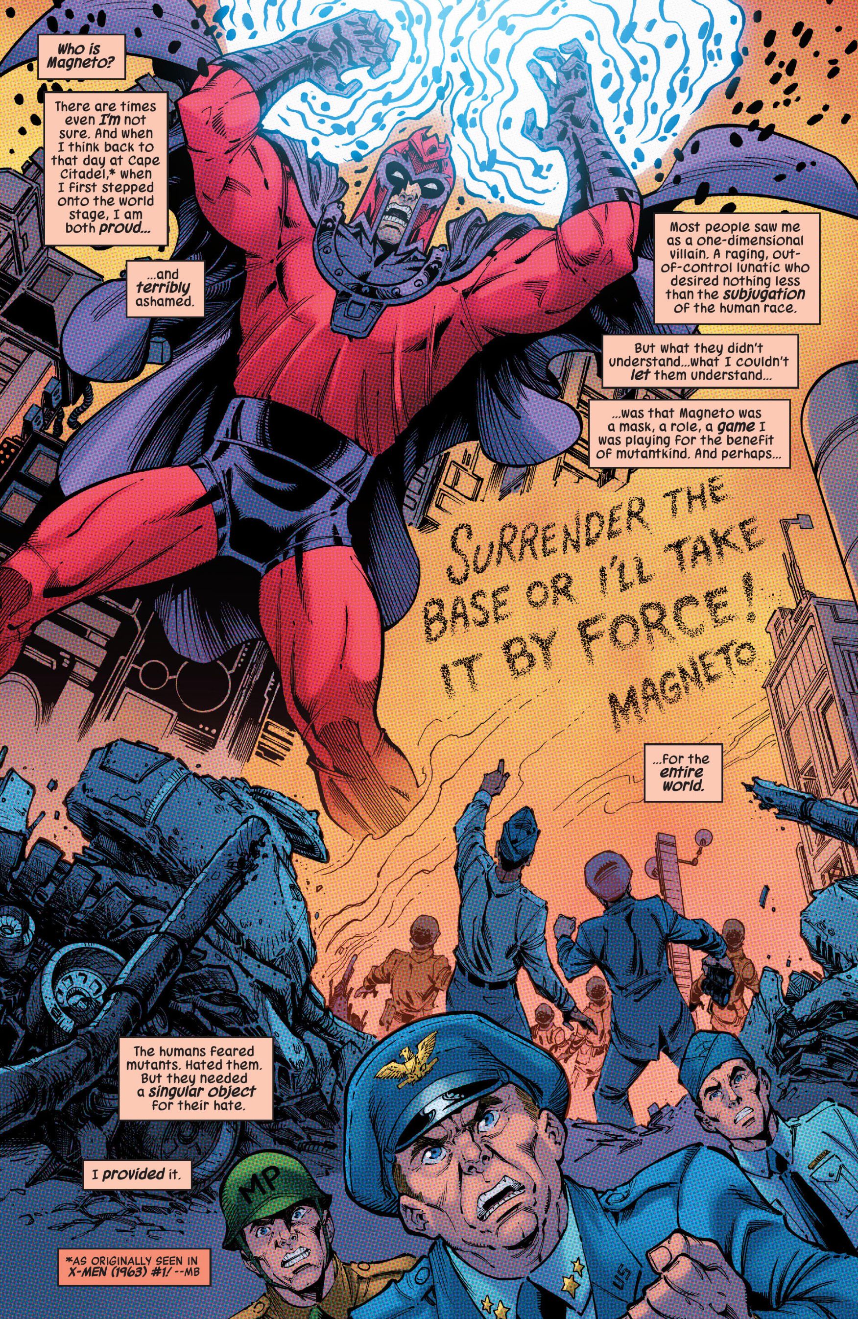 En Magneto # 1, luego de una sesión de práctica de Danger Room, Magneto encuentra a Wolfsbane leyendo uno de los libros del Profesor X; más específicamente, está leyendo un capítulo sobre el debut de Magneto en Cape Citadel, como se detalla en 1963’s X Men #1, tanto el equipo como el debut de Magneto. Ella le pregunta cómo reconcilia su pasado con su realidad presente como director. En un principio enojado, Magneto es incitado por la pregunta a reflexionar sobre su vida, desde su infancia en un campo de concentración hasta conocer al Profesor X. Reconociendo que fue visto como un villano de una sola nota, luego hace una afirmación increíble: era todo. un acto.