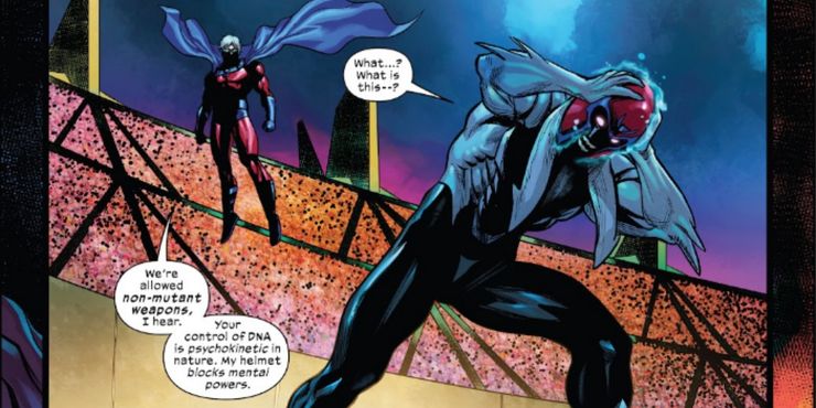 Magneto elige usar solo un casco en su batalla contra Tarn, consciente de que los poderes de su oponente ya se han interrumpido y no podrá usar sus propios poderes cuando comience el duelo. Pero podría haber elegido enfrentarse al Profesor X de una manera completamente diferente, haciendo un casco duplicado para estar protegido mientras avanza hacia su viejo amigo. Sin embargo, en cambio, usa solo un casco, y con fines defensivos, para mantener a los telépatas fuera de su propia mente. Al hacerlo, Magneto demuestra ser un hombre mucho mejor que Profesor X y el X Men alguna vez realizado.