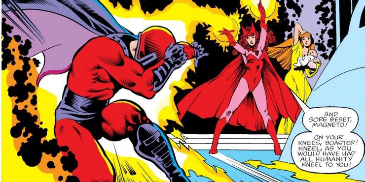Aunque Magneto puede ver a Scarlet Witch como su progenie, tiene una forma indudablemente horrible de mostrar su afecto. Al salvar a Wanda y a su hermano de una turba enfurecida en su primer encuentro, Magneto prácticamente los extorsiona para que se unan a su causa. Mucho más tarde, después de que Scarlet Witch se casara con Vision, Magneto reaparecería en sus vidas y buscaría una nueva relación, pero la vacilación de los hermanos para aceptar pistas sobre el abuso anterior de Magneto. Cuando los poderes de Scarlet Witch se volvieron demasiado poderosos para contenerlos, Quicksilver la convenció de crear un mundo donde los mutantes reinaran de manera suprema. Sin embargo, cuando Magneto se enteró de las acciones de Quicksilver, lo mató, lo que provocó que Scarlet Witch resucitara a su hermano y despojara a la mayoría de la población mutante. Aunque Scarlet Witch ha vuelto en gran medida a su papel heroico tras los acontecimientos de Casa de M, la Empyre El evento muestra que todavía está atormentada por la culpa por su papel en M-Day. Ella trata de hacer las paces resucitando a los mutantes muertos de Genosha, pero solo logró crear una horda de seres parecidos a zombies.