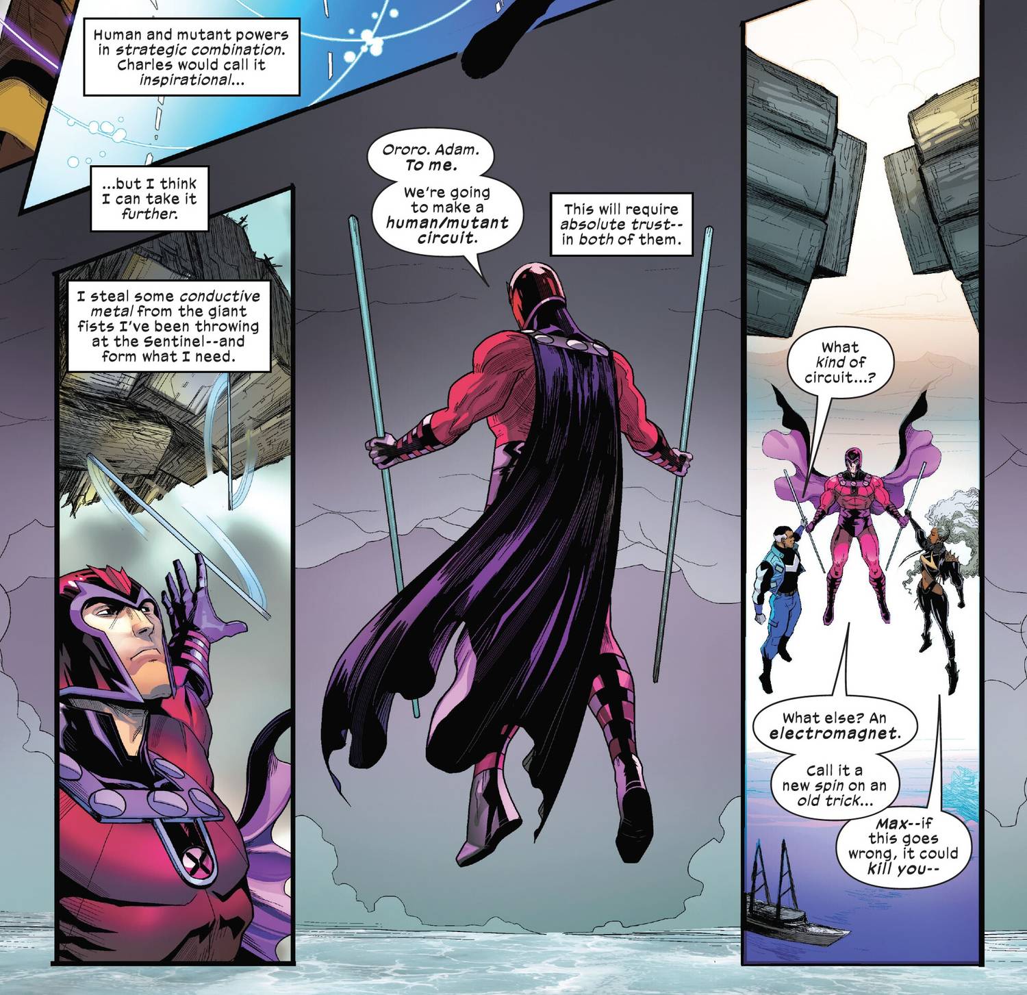 En una demostración de control y táctica, Magneto propone un “circuito humano/mutante”, con él en el centro. Animado por el poder de Storm, Adam regulando y haciendo circular la energía, y su propia ira, Max se obliga a sí mismo a través de un dolor intenso a golpear repetidamente al Stark Sentinel, lo que finalmente lo lleva a su derrota. No sólo lo hace demuestra que Max todavía está en su máximo poder, el ataque es una muestra de cuánto ha cambiado su estrategia.. La medida requería “confianza absoluta” tanto en Ororo como en Adam, lo que habría sido inaudito en los primeros días de Magneto. En este caso, con el crecimiento vino la victoria.