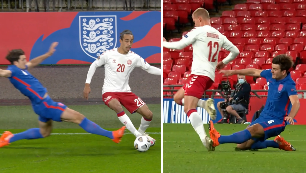 En el minuto 5, en una acción sobre la línea de banda, Maguire se lanzó a por el tobillo derecho de Yussuf Poulsen, que se retorció de dolor mientras retumbaban sus gritos en el vacío estadio de Wembley. Una acción de clara expulsión directa que se quedó en una cartulina amarilla para perplejidad de los daneses.