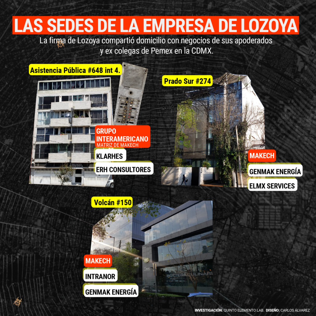 Una investigación de Quinto Elemento Lab descubrió que este grupo de exfuncionarios y asesores no solo tienen en común haber participado en la firma de Lozoya, sino que varios de ellos contribuyeron al nacimiento de otras empresas que compartieron al menos tres domicilios con la empresa del exdirector de Pemex. Varias de esas personas y compañías ya están bajo investigación de la Unidad de Inteligencia Financiera (UIF).