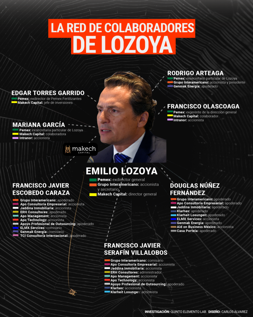 Lozoya creó Makech Capital de la mano de Rodrigo Arteaga, su exsecretario particular en Pemex, y en ese fondo también coincidieron otros tres antiguos colegas de la petrolera: Édgar Torres Garrido, Francisco Olascoaga Rodríguez y Mariana García de la Cadena Salas. Una triada de contadores y abogados también confluyeron en la fundación de la compañía que dio origen a Makech: Francisco Javier Escobedo Caraza,
