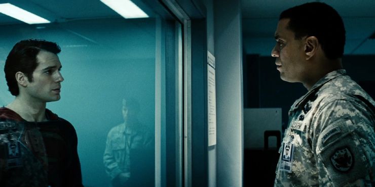 El general Swanwick entra en la sala de reuniones y pregunta sobre un objeto misterioso que entra en la atmósfera de la Tierra y que resulta ser la nave de Zod. Después de su reunión final con Superman, el oficial subordinado de Swanwick comenta que Superman está caliente y le dice al capitán que regrese al auto.