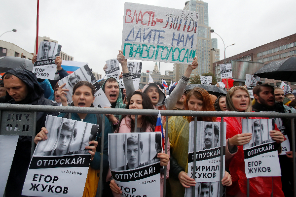 Los manifestantes llevaban pancartas con leyendas como “Denos el derecho al voto” , y alusivas en apoyo a los activistas detenidos en las pasadas protestas en especial a Yegor Zhukov, un estudiante de 21 años, que fue arrestado y enfrenta hasta ocho años de prisión acusado de “disturbios masivos”.