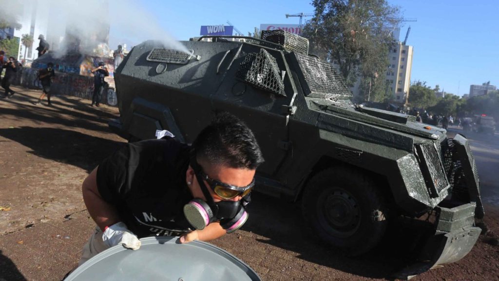 En la zona había decenas de Carabineros (Policía chilena) y durante horas se dieron cruentos enfrentamientos entre manifestantes y agentes, que usaron gases lacrimógenos y chorros de agua para dispersar la concentración.