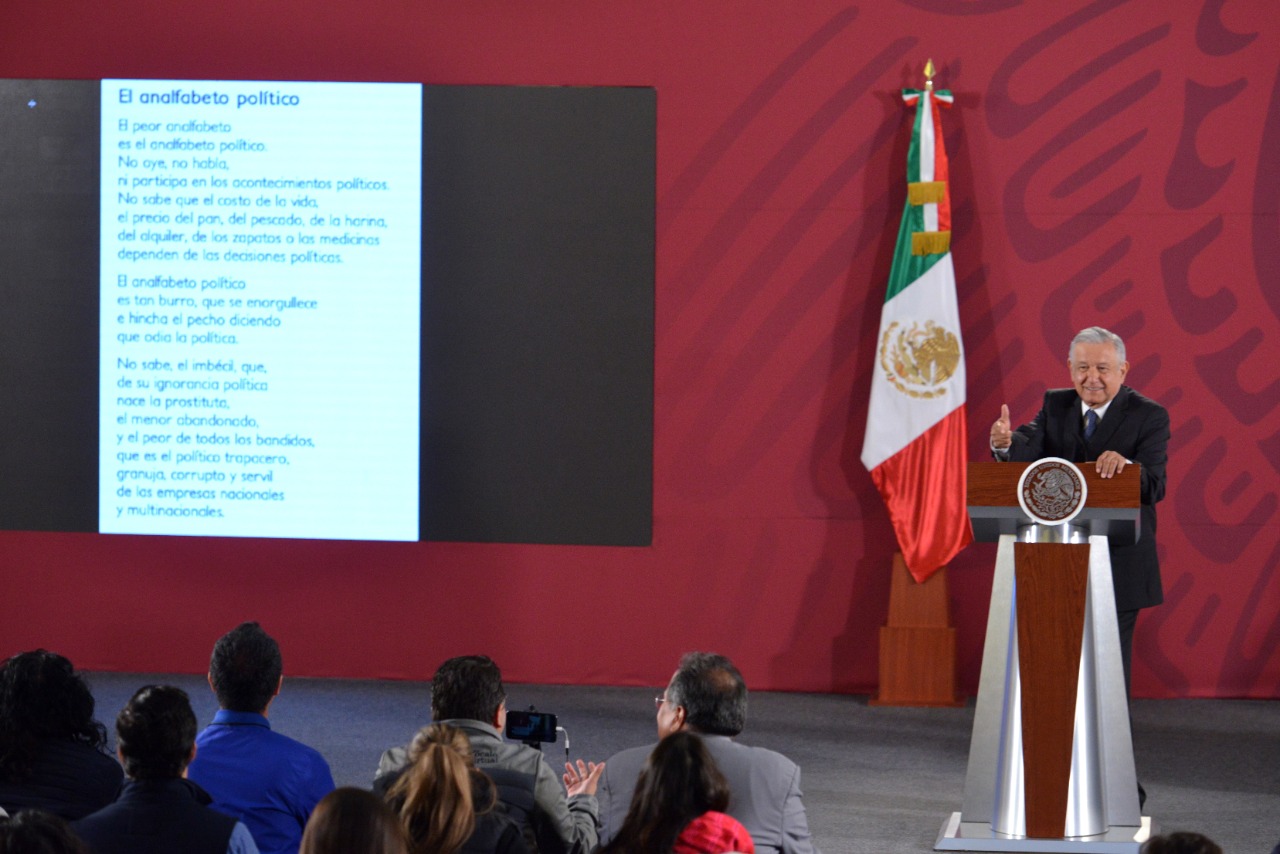 Y puso en la pantalla de Palacio Nacional, el texto “El analfabeto político” del dramaturgo y poeta alemán Bertolt Brecht.