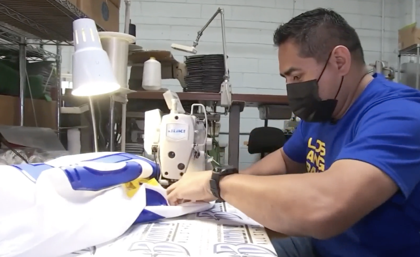 Un grupo de trabajadores hispanos en el Valle de San Fernando fueron los encargados de bordar y ajustar las camisetas que estarán usando los jugadores de los Rams de Los Ángeles en el Super Bowl LVI.