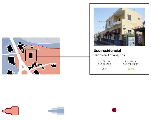 Otras 1650 están intactas pero en riesgo, la mayoría en dirección al mar. Son las edificaciones que se encuentran sobre las trayectorias posibles de las lenguas de lava, según las predicciones probabilísticas de la Universidad de la Laguna.