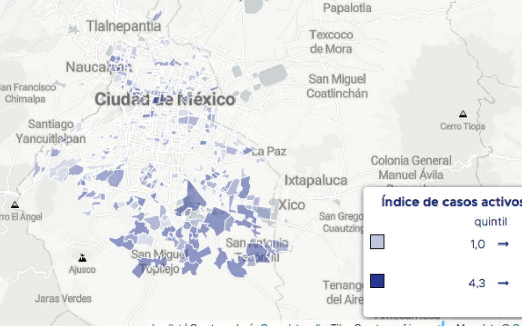 El color del mapa se calcula por quintiles: “Se acomoda la totalidad de casos activos en las colonias para dividirse en 5 partes iguales. Así, la colonia de color más claro pertenece al quintil más bajo (con menos casos) y la colonia del color más oscuro pertenece al quintil más alto (con más casos)”, afirma la presentación elaborada por la Agencia Digital de Innovación Pública.