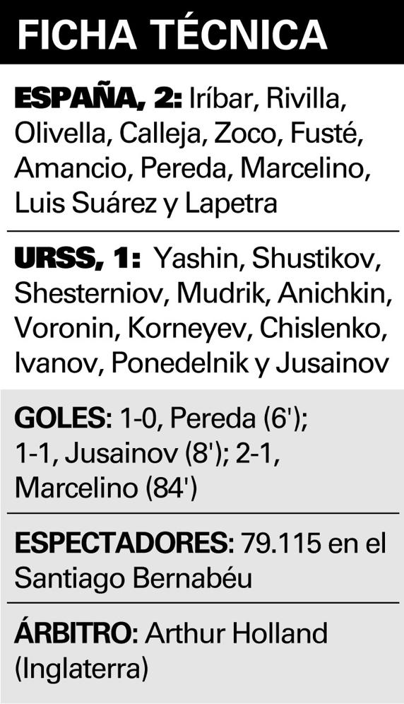 Galimzian Jusainov, delantero del Spartak de Moscú, empató para los soviéticos y el zaragocista Marcelino, a pase de Pereda, dio a España con su mítico gol de cabeza el primer gran título de su historia.