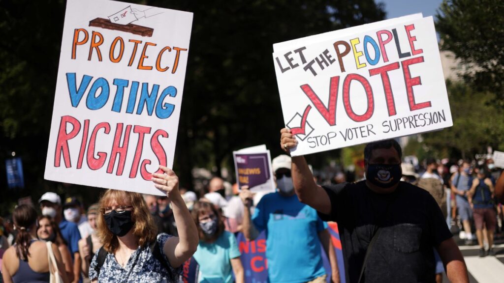 Los participantes en la protesta portaron pancartas con mensajes como “Protejan los derechos civiles” o “Es 2021 ¿Por qué todavía tenemos que luchar por el derecho a voto?”.