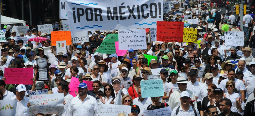Vestidos de blanco, con pancartas, mantas y letreros gritaron consignas contra el presidente #AMLO, al 5o.mes de gobierno. pic.twitter.com/sEZzRXCDBr— Pepe Cortazar N (@PepeCortazarN) 5 de mayo de 2019