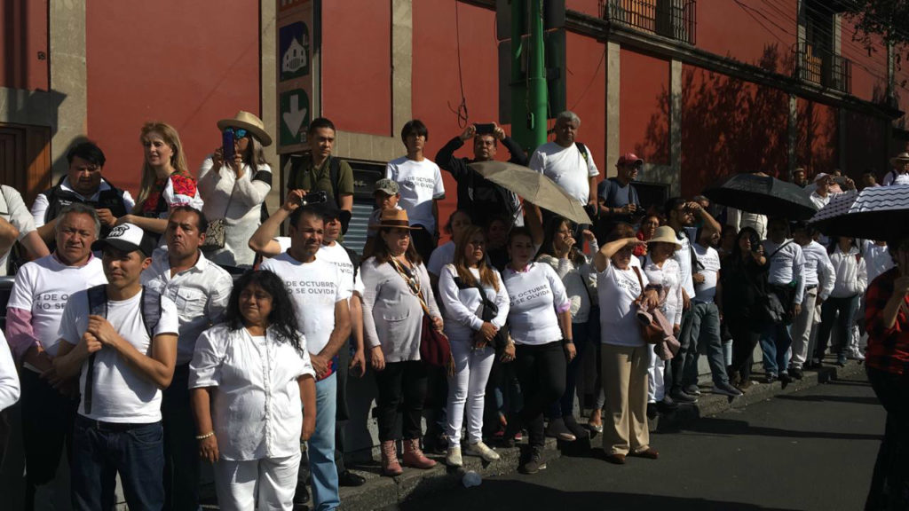 Todo el trayecto está prácticamente resguardado por un cinturón de seguridad formado por personas, una buena parte de la tercera edad, vestidas con ropa de color blanco y playeras con la leyenda “2 de octubre no se olvida”.