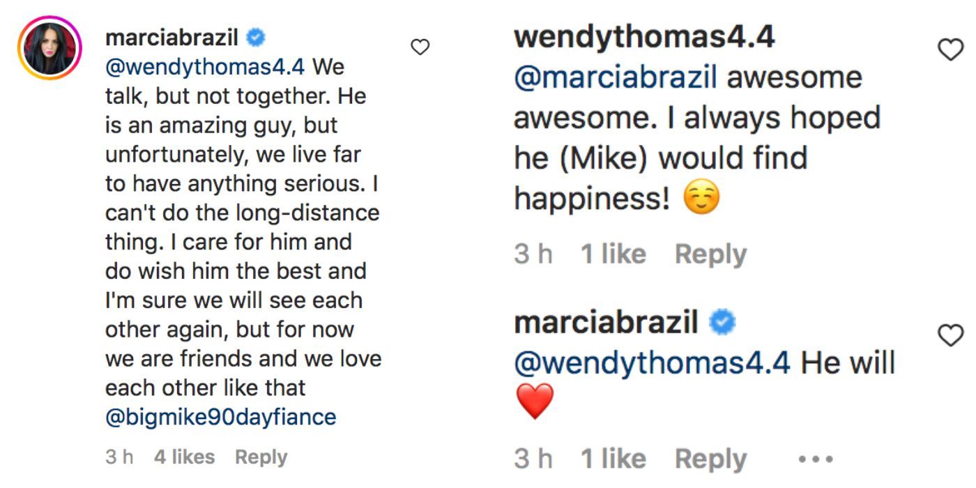 Marcia dijo que ella y Mike viven demasiado lejos para “tener algo serio” estableciendo además el motivo de su separación. Ella añadió, “No puedo hacer lo de larga distancia”. A pesar de hablar sobre su ruptura, la estrella de telerrealidad confirmó sus sentimientos por la estrella de TLC. Ella escribió, “Me preocupo por él y le deseo lo mejor y estoy seguro de que nos volveremos a ver”. esperando que sus caminos se crucen algún día. Marcia agregó que Mike tiene sentimientos mutuos y se aman como amigos. Ella le dijo al fanático que espera que el Prometido de 90 días la estrella encuentra la felicidad.