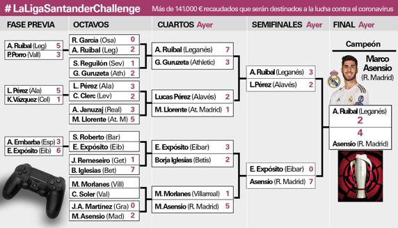Llanos se la apuntó Marco Asensio a los mandos de su Real Madrid después de superar a por 2-4 al Leganés dirigido por Aitor Ruibal. Pero lo más importante sin duda es el apoyo económico obtenido en este torneo FIFA solidario destinado a apoyar a UNICEF y la lucha contra el coronavirus. Al fin de la emisión eran más de 142.000 euros los recaudados para la batalla contra el virus del Covid-19.