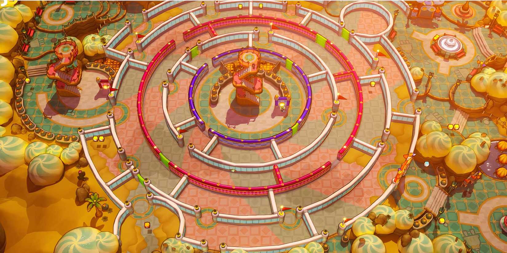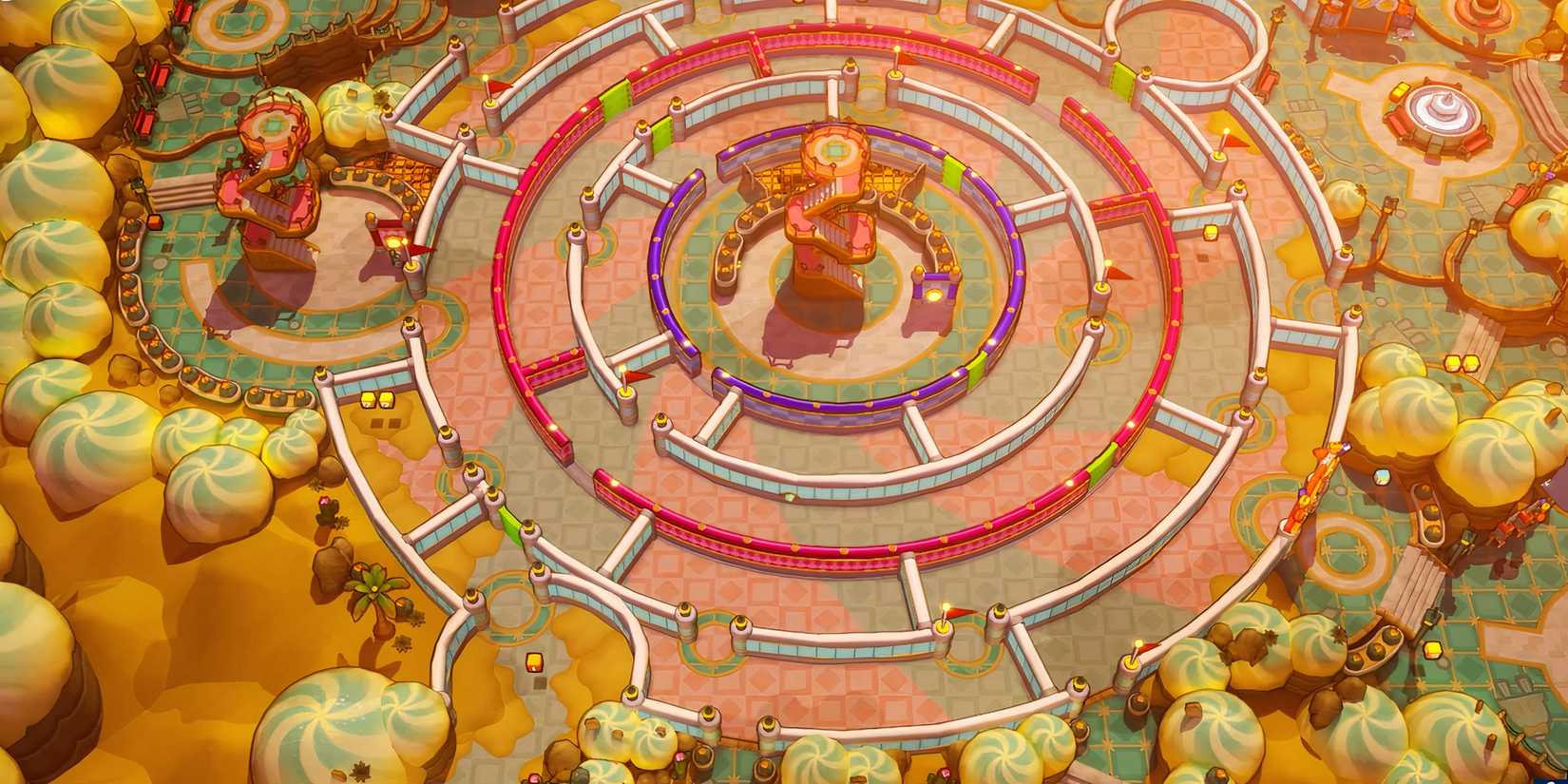 El laberinto de la isla Merrygo en Mario y Luigi: hermandad Es un laberinto bastante difícil lleno de acertijos y enemigos. Es un laberinto circular con dos círculos de pared móviles que se pueden girar mediante interruptores en las torres de vigilancia. El círculo interior es morado y está controlado por un interruptor en Central Lookout Plaza, mientras que el círculo exterior es rojo y está controlado por un interruptor en West Lookout Tower.