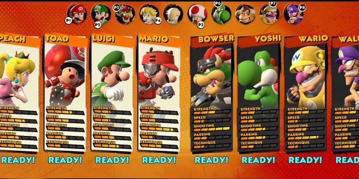 Las estadísticas afectan todos los aspectos de un partido en Mario Strikers: Liga de Batalla, y comprender las fortalezas y debilidades de cada personaje puede marcar una gran diferencia. Cada personaje tiene estadísticas básicas de Fuerza, Velocidad, Disparos, Pases y Técnica, pero se pueden modificar mediante conjuntos de equipo. Ganar partidos de fútbol en Mario Strikers: Liga de Batalla dependerá en gran medida de aprovechar las fortalezas de los personajes y compensar las debilidades.