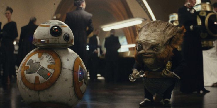 El pequeño jugador anfibio es visible en otras tomas en el casino, incluso cuando los Fathiers, una criatura que presentó la trilogía secuela, se precipitaron por las calles de Canto Bight.