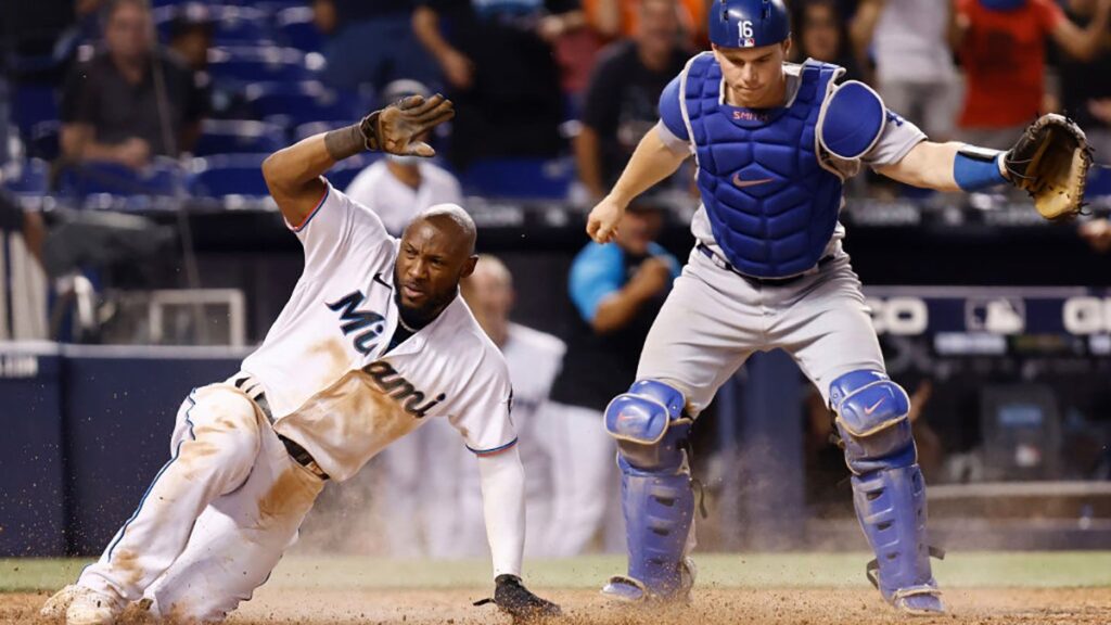 El corredor automático Starling Marte avanzó a tercera en un wild pitch de Blake Treinen y llegó hasta el plato cuando el catcher Will Smith hizo un lanzamiento descontrolado que se fue más allá de tercera base, un error que puso fin al juego en el 10mo inning y dio a los Marlins de Miami una victoria 2-1 el martes sobre los Dodgers de Los Ángeles.