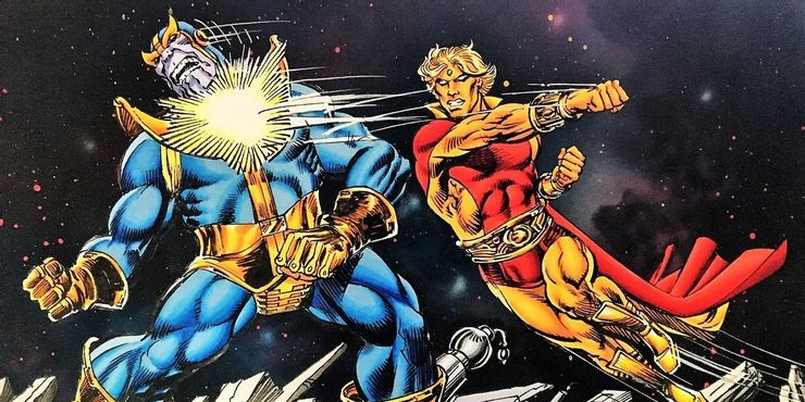 Adam Warlock y Thanos tienen una larga y ardua historia de duelos entre ellos. Warlock se enfrentó por primera vez al Titán Loco en el original. Guantelete del infinito historia en la que manipuló a Thanos para que pensara que el Titán no necesitaba el guante el tiempo suficiente para que Adam lo agarrara.