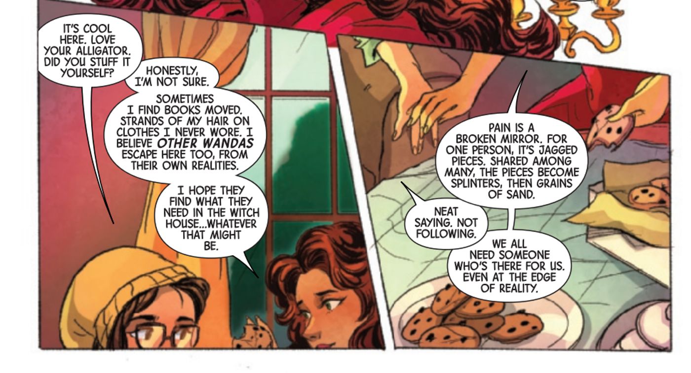 En Mujeres de maravilla #1, la historia “Witch House” de Sarah Rees Brennan, Arielle Jovellanos y Brittany Peer encuentra a Wanda en una casa misteriosa en “el nexo de todas las realidades” Cuando la visita Darcy Lewis del MCU, Wanda explica que la casa se encuentra justo fuera del ámbito de la realidad, lo que le da un respiro del caos que soporta en su vida. Sin embargo, también menciona que nota algo extraño de vez en cuando. vez cada vez que regresa allí: no parece estar sola.