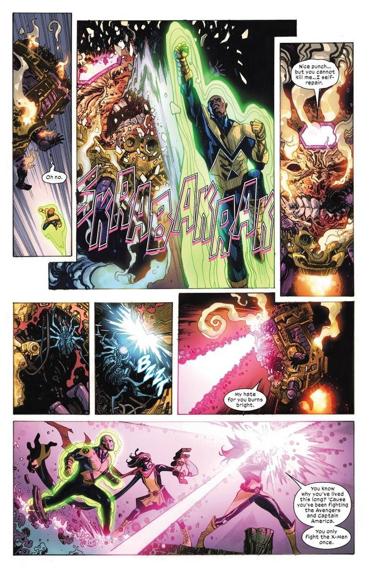 X Men El número 34 está escrito por Gerry Duggan y dibujado por Joshua Cassara. MODOK, quien recientemente se alineó con Orchis contra los X-Men, está luchando contra Synch, Ms. Marvel y otros miembros del equipo. Synch le da lo que debería haber sido un golpe devastador a MODOK, pero en lugar de eso, el villano se jacta de “autorepararse”. En ese momento, pequeñas arañas mecánicas salen de su cuerpo y comienzan a reparar el tejido de la piel y los huesos.