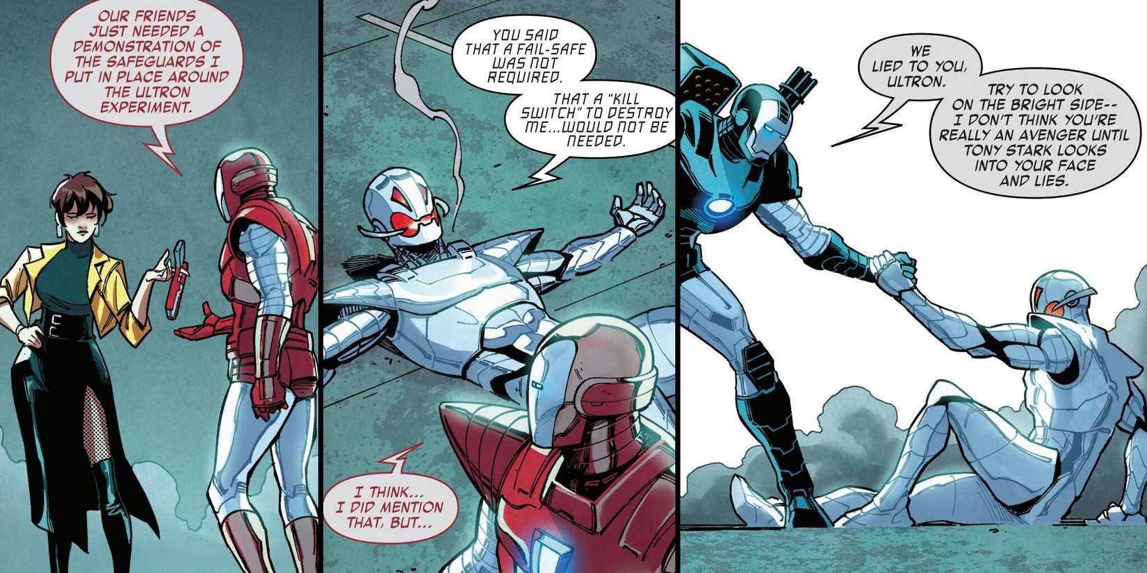 Esta idea viene por cortesía de Vengadores de la costa oeste #6 por Gerry Duggan, Ton Lima, Arthur Hesli y Joe Caramagna. El tema enfrenta a los Vengadores de Capitán Marvel contra Iron Man y War Machine West Coast Avengers, luchando exactamente sobre qué hacer con el nuevo “bueno” Ultron. Aunque Tony y Rhodey creen en su capacidad para cambiar, sus compañeros de equipo de la costa este no están tan convencidos, y el conflicto obliga a Stark a revelar el Killswitch que puso en su lugar para detener a Ultron si se vuelve necesario.