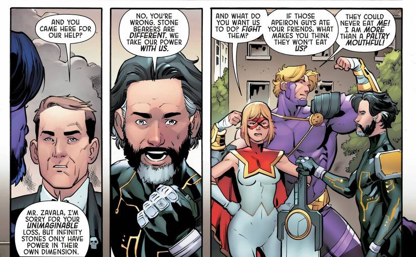 En El Reloj infinito #1 de Derek Landy y Ruairí Coleman, Marvel revela el nuevo status quo de las Infinity Stones. En esta historia, el recién formado Infinity Watch es atacado por un misterioso grupo conocido como Apeiron. Este grupo parece ir de universo en universo, consumiendo las Piedras del Infinito y absorbiendo su poder. Son perseguidos por un hombre llamado Avery Zavala: el último de su universo y un Portador de Piedra, alguien que ha sido fusionado con una Piedra del Infinito.