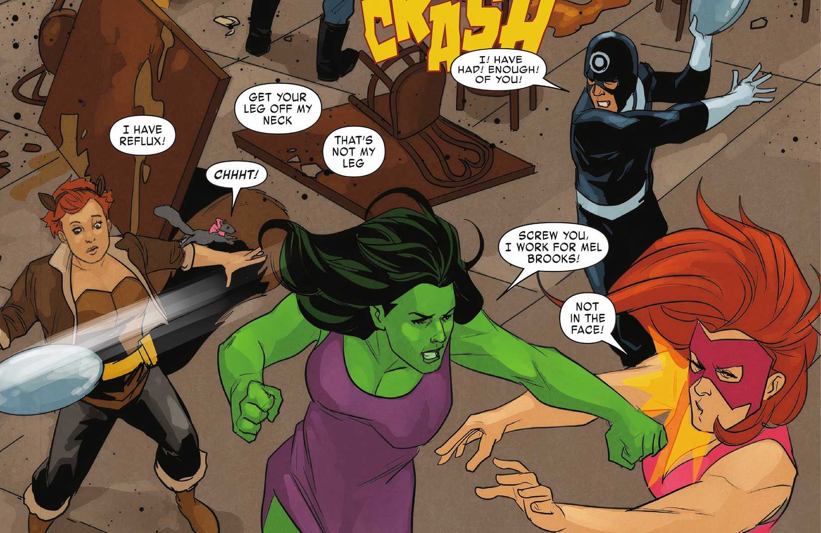 No pasa mucho tiempo antes de que ocurra lo inevitable y Venom provoca accidentalmente una pelea debido a su escisión. Los héroes y villanos chocan entre ellos y todo el infierno comienza a soltarse. Durante la pelea, se puede ver a She-Hulk luchando contra Titania. Mientras golpeaba a su enemigo en la pelea, She-Hulk menciona que trabaja para la leyenda cómica Mel Brooks.