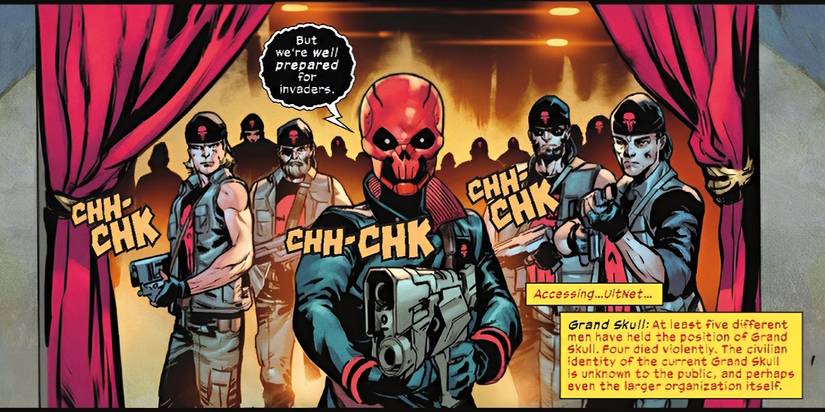 A medida que los Ultimates atraviesan rápidamente el complejo principal de los Red Skulls, Castletown, finalmente enfrentan al líder actual de la organización: el Grand Skull. Mientras que el Grand Skull es un enemigo poco impresionante, su preciado trofeo demuestra que Incluso las amenazas relativamente menores del universo final no deben ser ignoradas.