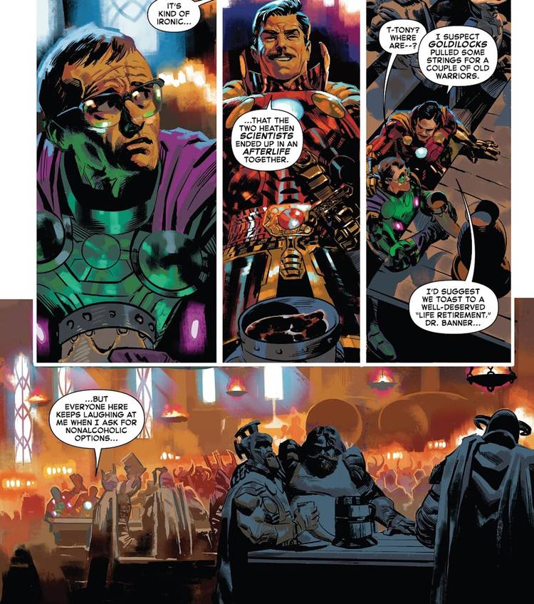 - El cómic muestra a Tony reuniéndose con Bruce Banner en Valhalla, y Thor ha roto las reglas para dar la bienvenida a sus amigos al paraíso de los guerreros.