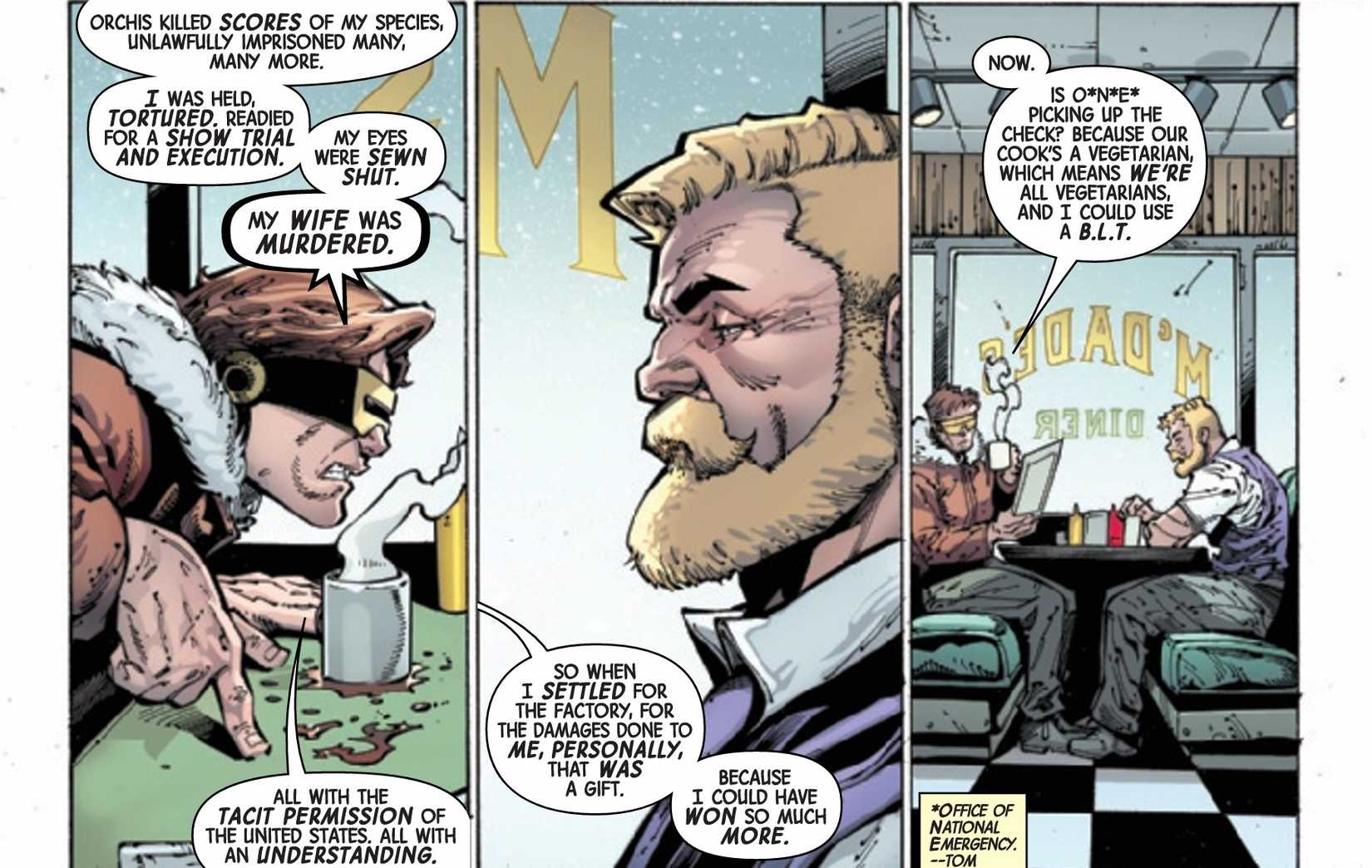 El problema en sí mismo explica perfectamente por qué Cyclops podría no estar en tan buen estado mental. Como le recuerda al agente Lundqvist sobre la Oficina de Emergencia Nacional (ONE), Al final de la era krakoana anterior, Cíclope fue torturado y condenado a muerte. Por la coalición antimutantes Orchis. Ahora, se muestra valiente como uno de los mutantes públicos más destacados, pero acaba de sufrir una gran cantidad de traumas y, como es habitual, aparentemente los ha internalizado en lugar de recibir ayuda.