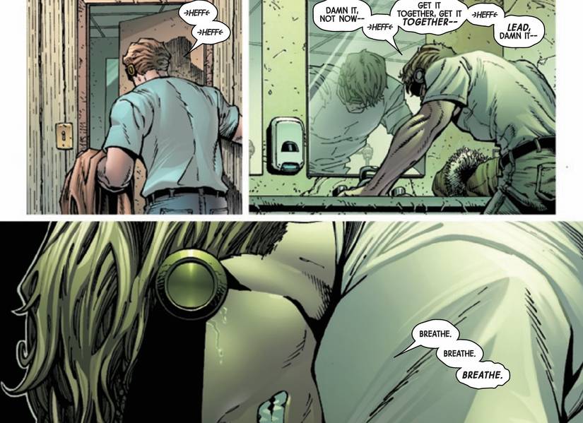 En X-Men #3 de Jed MacKay y Ryan Stegman, los lectores ven Cíclope lucha contra la ansiedad y sufre un ataque de pánico en un baño. mientras intenta recomponerse y ser aquello con lo que nunca antes ha tenido problemas: ser un líder imperturbable.